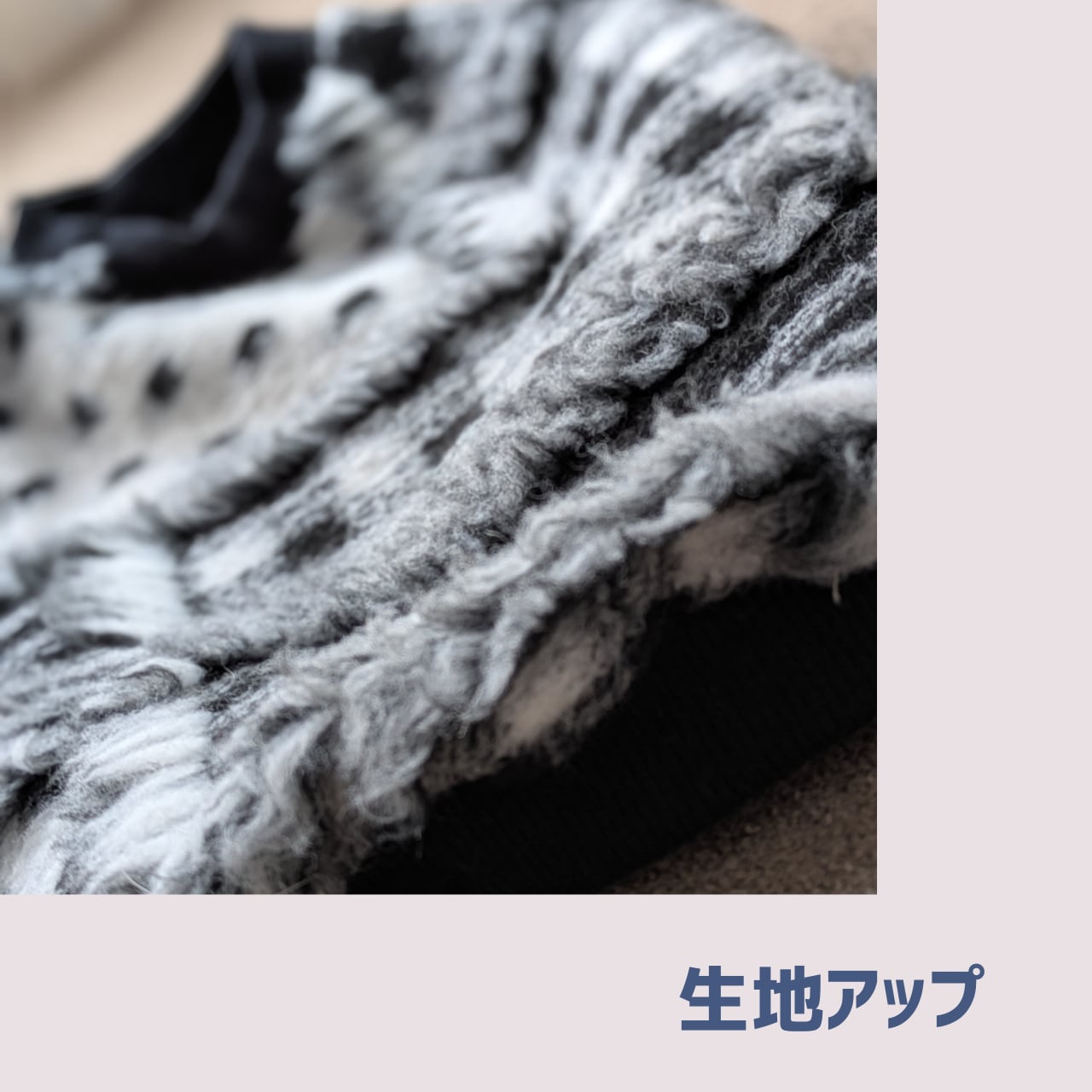 着心地も軽くて温かいボア素材です。生地は厚みのある部分とそうでない部分が組み合わさっているので、よくあるボアのお洋服よりさらっとした感じがあります。カジュアルにももちろん、エレガントさもあるので、おうちでのリラックスタイムや、お出かけにも最適です。
